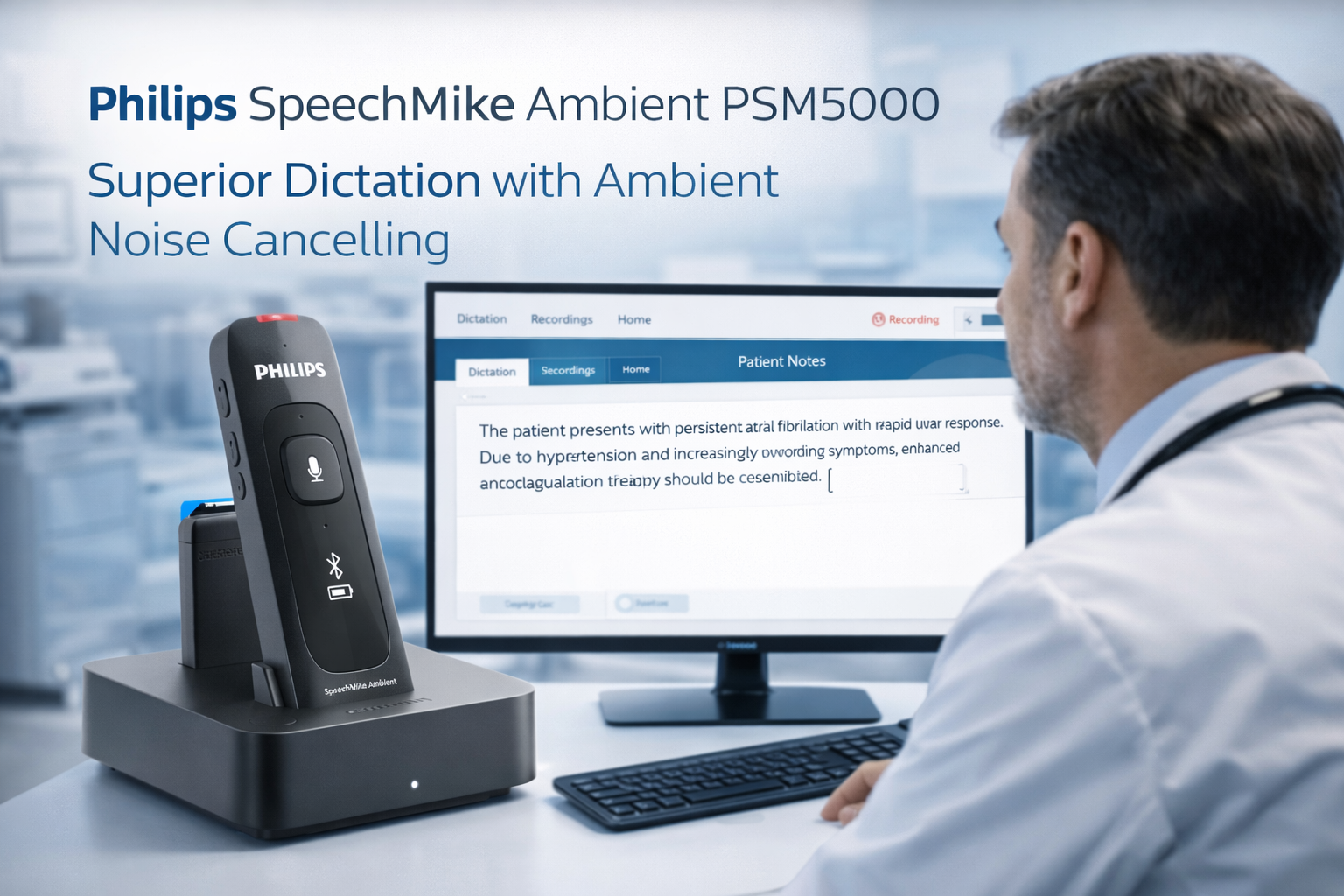 When clinicians evaluate speech recognition tools, the focus tends to land on the AI model: accuracy rates, specialty vocabulary, ambient listening capability. But the microphone capturing your voice is the input that determines everything else. Poor audio in means degraded recognition out — no matter how sophisticated the AI on the other end. The Philips SpeechMike Ambient was purpose-built for exactly this reality: a professional-grade dictation microphone designed to deliver clean, consistent audio in the real-world conditions of clinical practice, where noise, movement, and variable recording distances are the norm, not the exception.